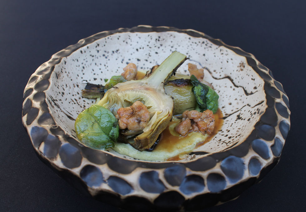 Añadimos la crema de puerro en la base del plato. Cortamos las alcachofas de la Vega Baja por la mitad, las marcamos a la brasa y las ponemos en el plato. Se añade la richihuela frita y el jugo de carne y soja.