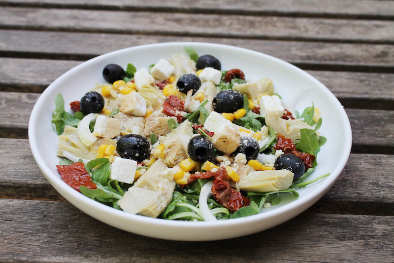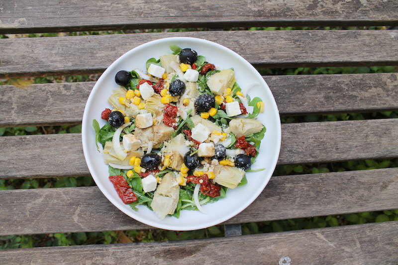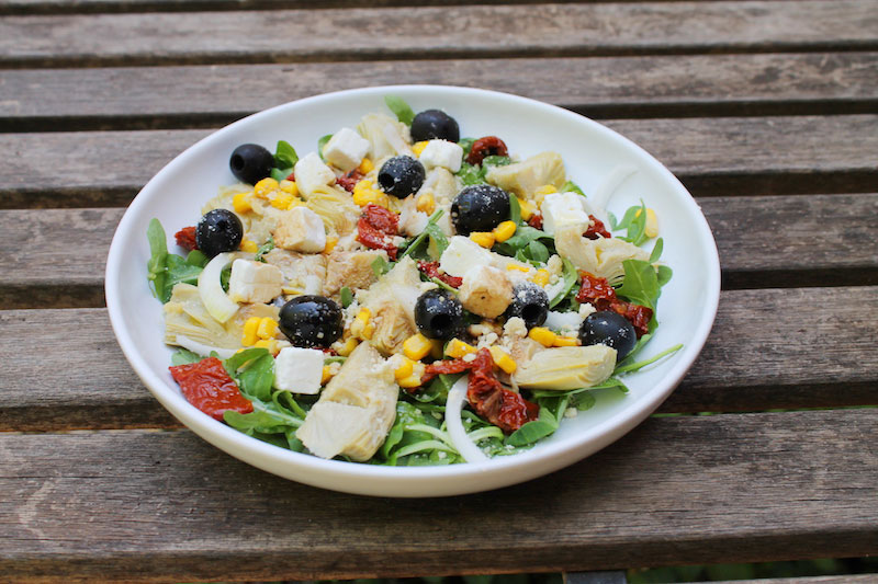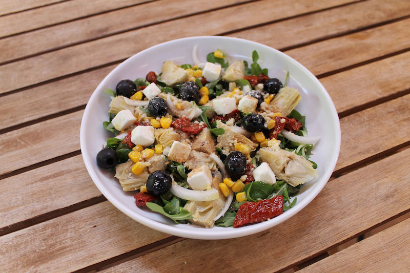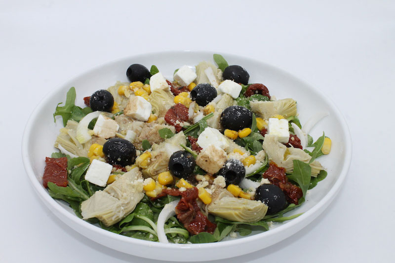 En un cuenco, mezclar las aceitunas, la cebolla, el maíz dulce, los trozos de queso feta, los canónigos y añadir las alcachofas de la Vega Baja en conserva y el tomate seco troceado.
