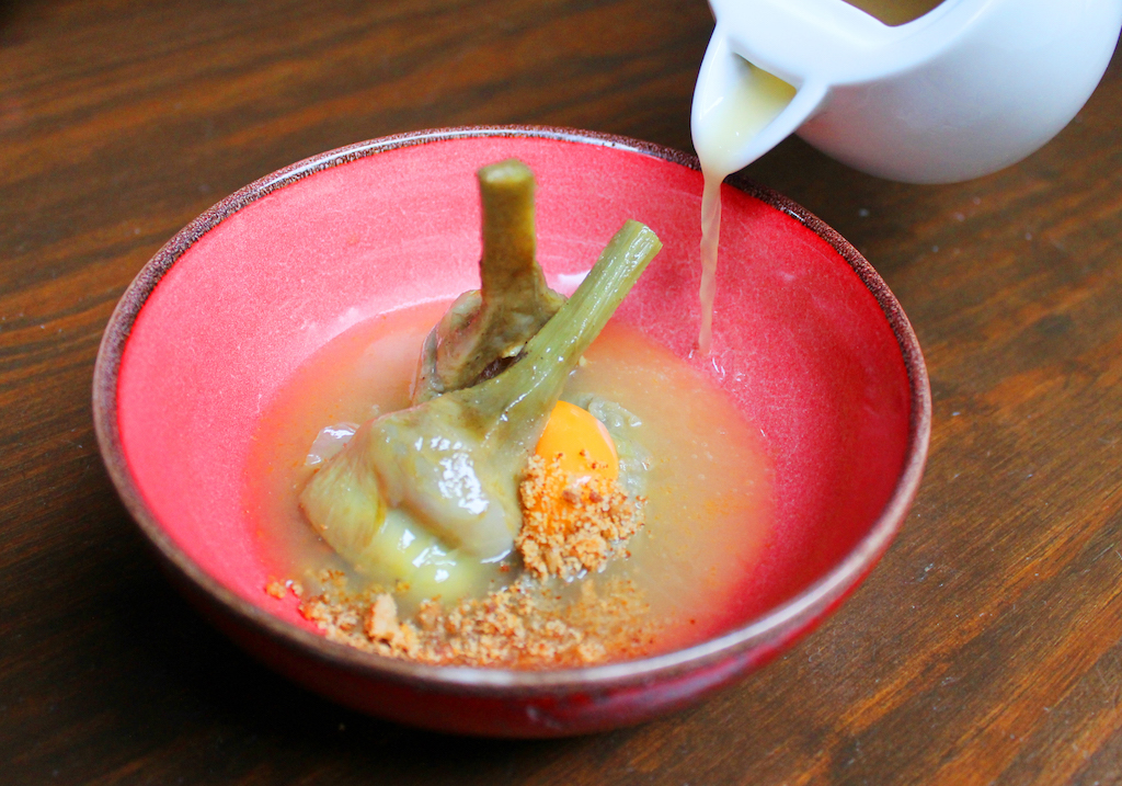 Colocar en la base el puré de alcachofa y sobre el mismo la yema del huevo, añadir las migas de tocino y encima las alcachofas a baja temperatura. Por último, regar con el caldo de jamón.