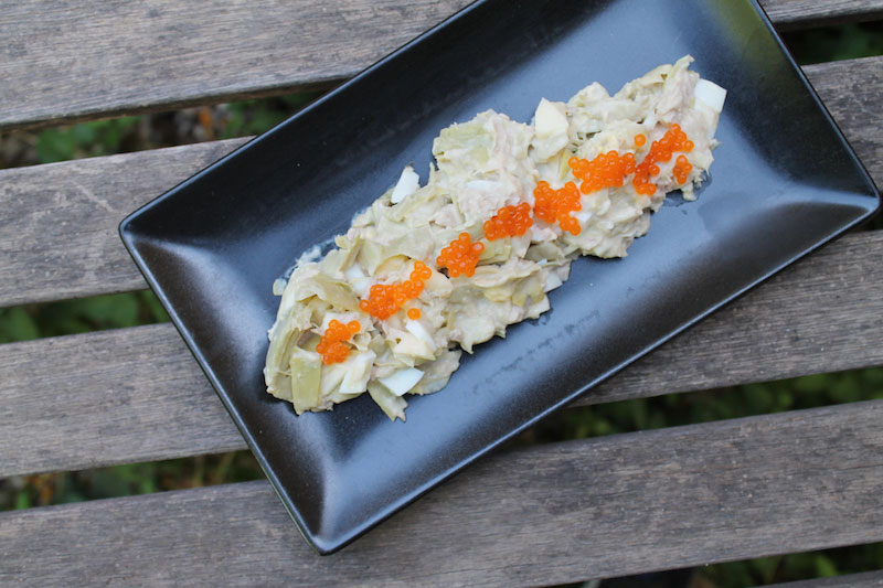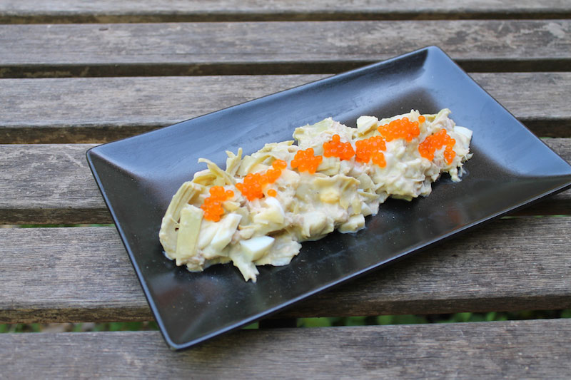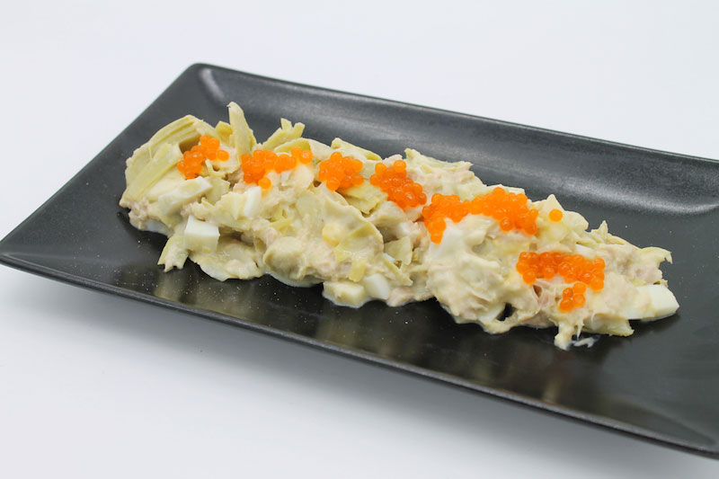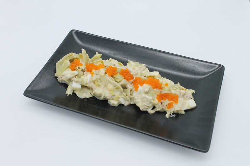 Incorporar la mahonesa al gusto y terminar el plato con huevas de salmón por encima de la ensaladilla.