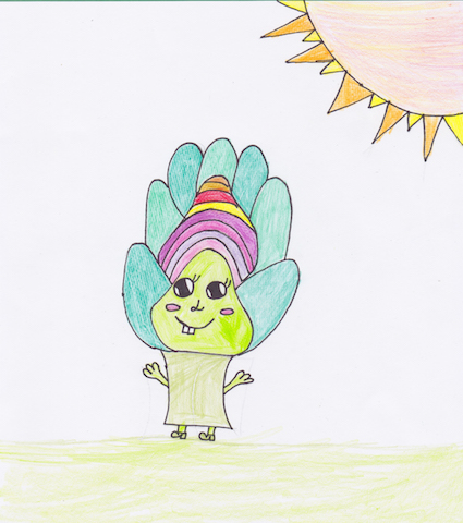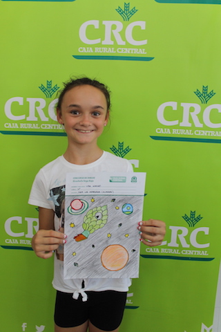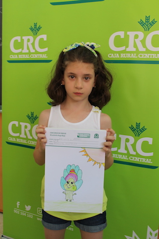 El tercer premio que consiste en un bono familiar para el Río Safari Elche y material escolar por valor de 60 euros para el colegio, ha recaído en Eva López Andreu del colegio Pascual Andreu de Almoradí con una mascota de alcachofa con un arcoiris.
