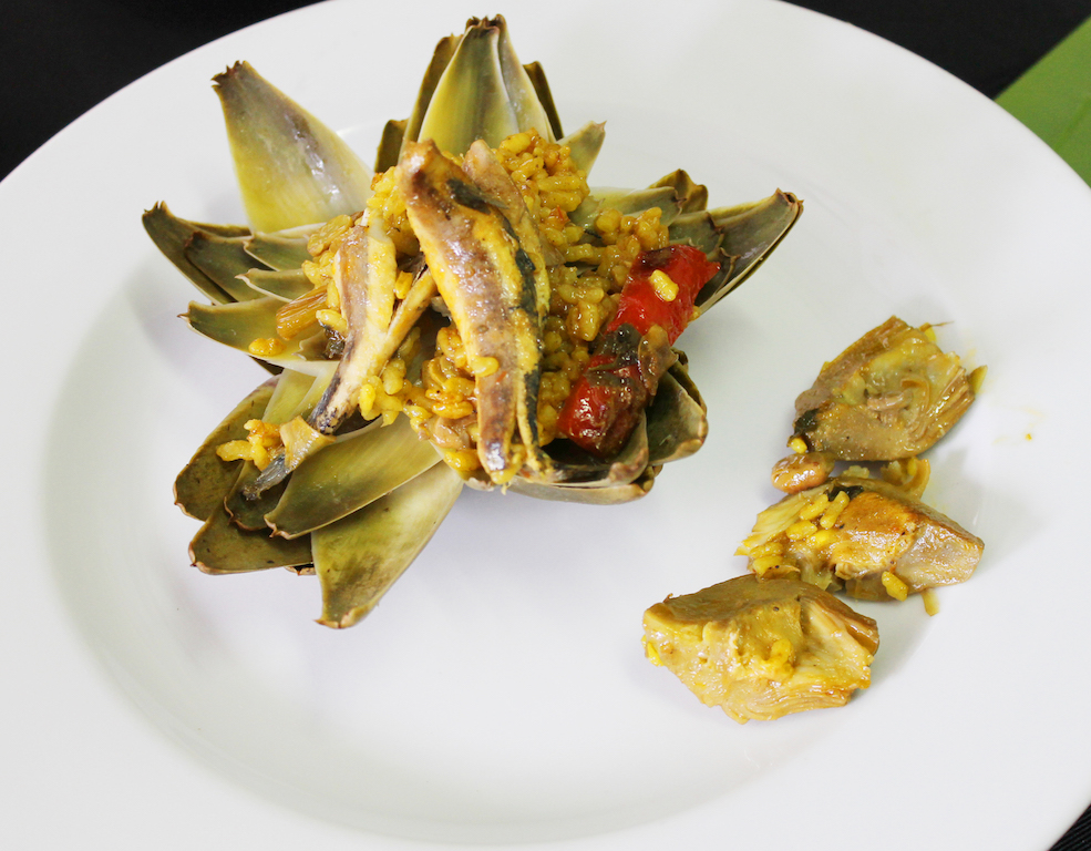 Podemos usar una alcachofa entera, previamente hervida, y abrirla en forma de flor. Poner el arroz en el corazón de la alcachofa y coronar el plato con unos filetes de boquerón.